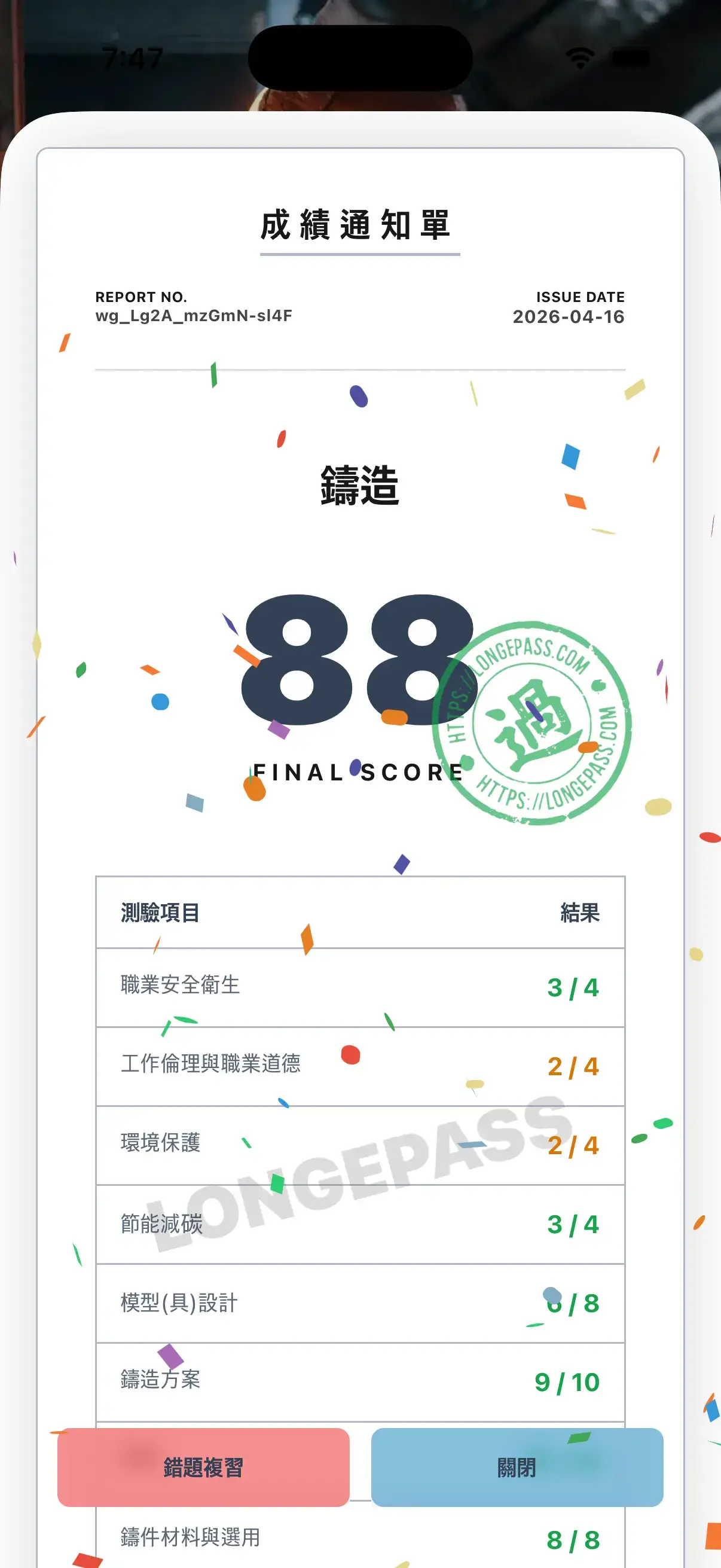 測驗結束後立即查看詳細成績與逐題解析,精準了解哪題做錯、為什麼錯。反覆回顧弱點題目,讓每次練習都成為成長的養分!