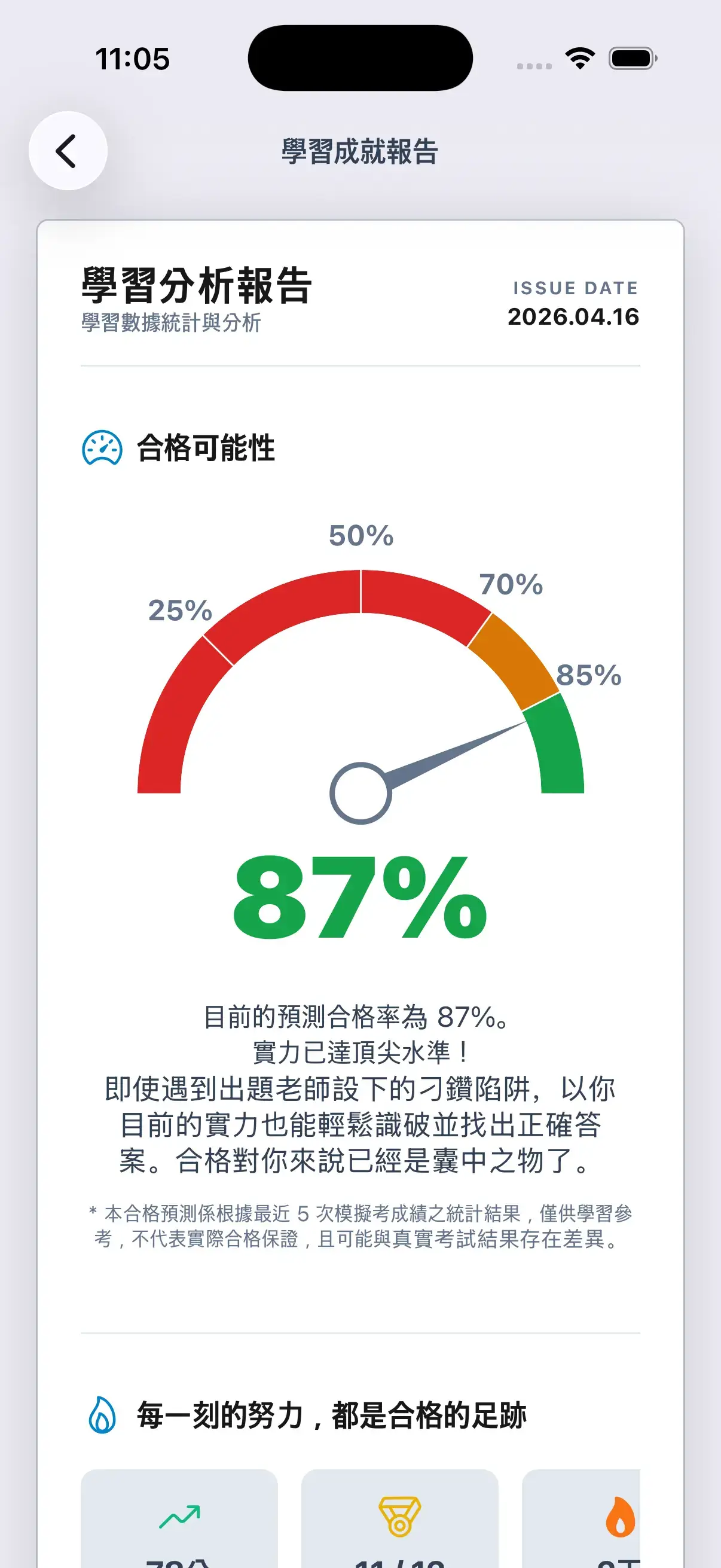 完成指定次數的模擬測驗後,系統即可自動解鎖您的個人專屬學習分析報告。