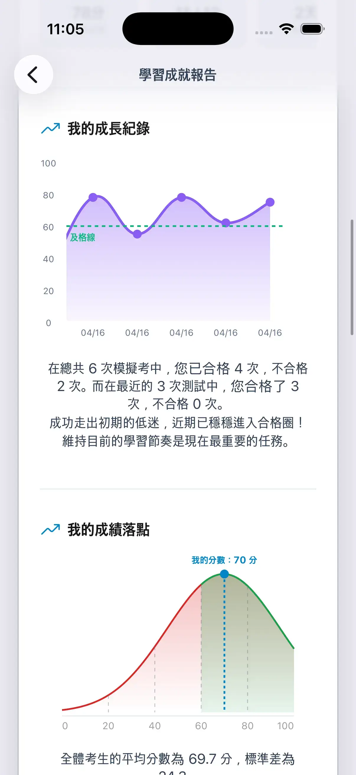 透過成長紀錄折線圖,清楚看見每次模擬考的分數變化,並與及格線即時對比。成績落點分析更能讓您知道自己在全體考生中的位置,制定最精準的衝刺策略!